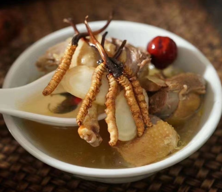 制法: 將雞把毛和內臟去掉洗干凈后,放入鍋中,加水燒沸后去掉鍋面上的浮沫,放入冬蟲夏草,用文火燉至雞肉爛熟即可。