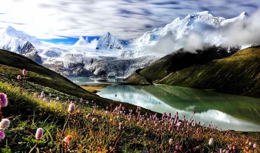薩普雪山每逢盛夏,薩普山頂冰雪皚皚、雨霧繚繞,山底花紅草綠、五彩斑斕、水草豐美。